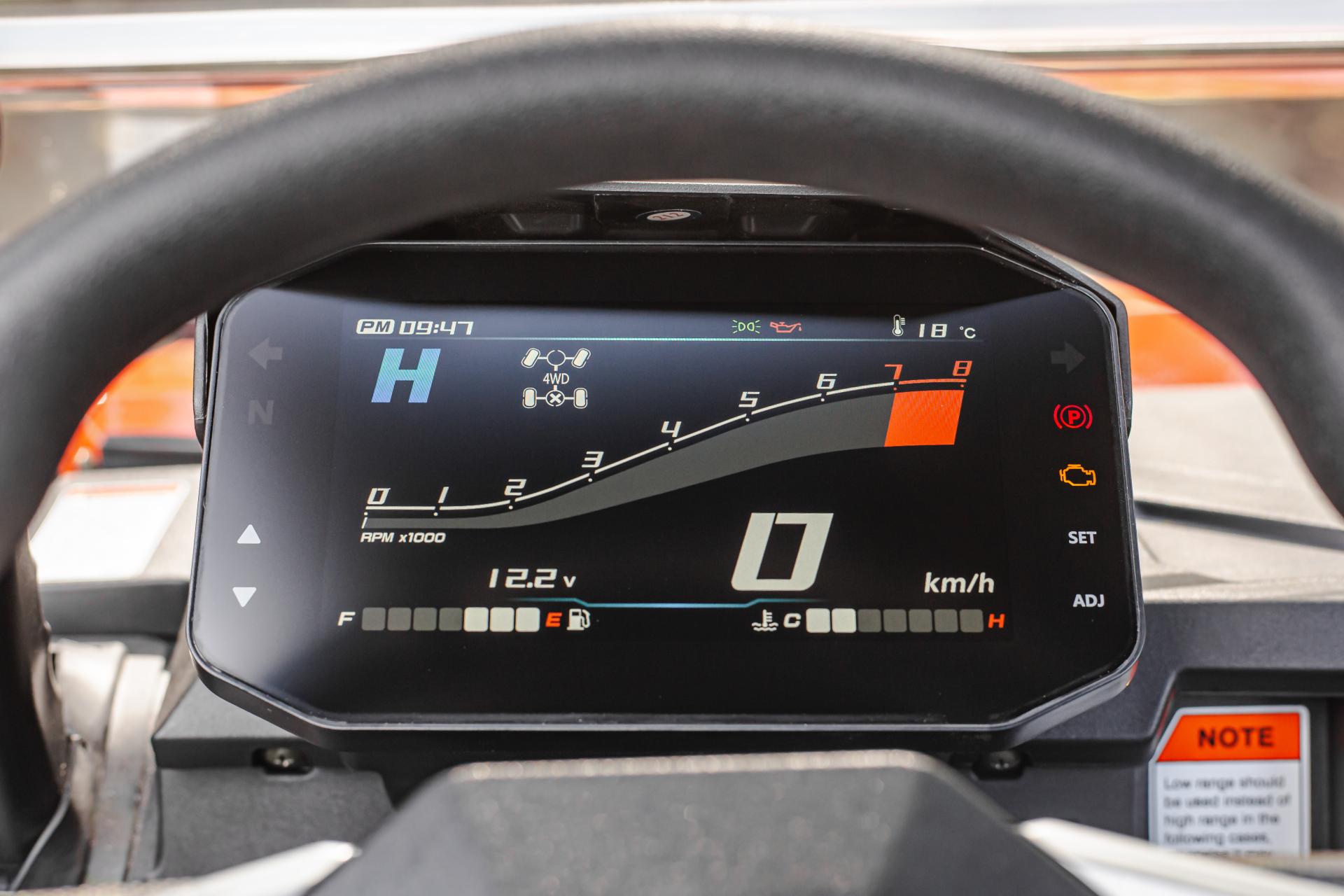 * Moderni värillinen TFT-näyttö, jossa on automaattinen päivä- ja yötilan vaihto, näyttää selkeästi ajonopeuden, moottorin kierrosluvun, polttoainetason, valitun vetotavan (2WD/4WD/LOCK), käytössä olevan vaihteen, jäähdytysnesteen lämpötilan, kokonais- ja matkamittarin lukemat sekä paljon muuta.