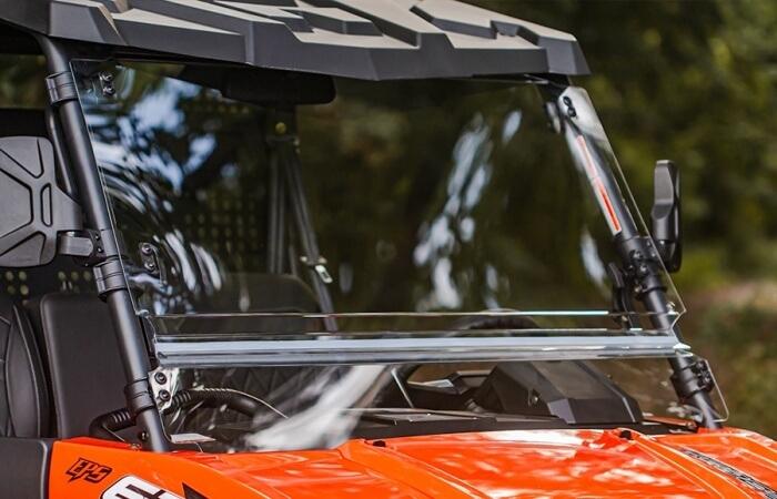 * Jaettu tuulilasi mahdollistaa sopeutumisen eri olosuhteisiin. Alaosa suojaa tuulelta, kun taas yläosa voidaan taittaa paremman ilmanvaihdon mahdollistamiseksi.