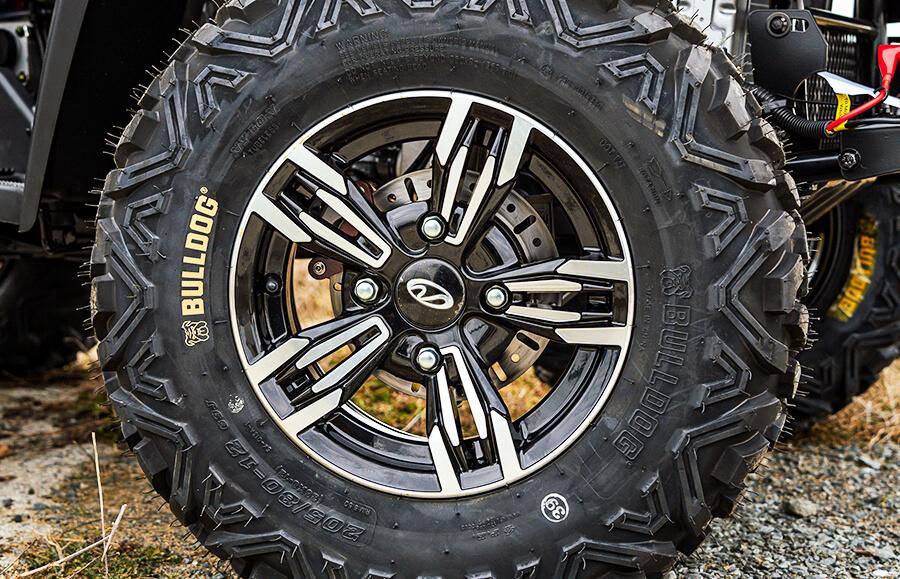 * Laadukkaat Bulldog -maastorenkaat, joissa on monikäyttöinen pintakuvio, tarjoavat luotettavan pidon, vakautta ja varmuutta monenlaisissa maasto-olosuhteissa. Tyylikkäät alumiinivanteet korostavat tämän mönkijän modernia ulkonäköä.